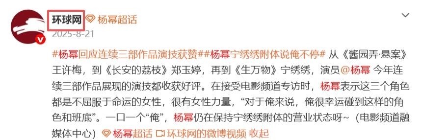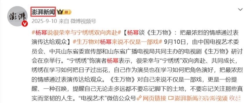 部分参考资料:1.杨幂回应连续三部作品演技获赞——环球网2.杨幂说很荣幸与宁绣绣双向奔赴——澎湃新闻